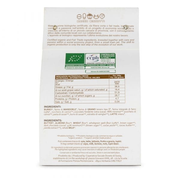 I baci di dama sono prodotti artigianalmente dagli ospiti della Casa Circondariale di Verbania. La formula è quella tradizionale, con laggiunta di farina di farro integrale, per un gusto più elegante e delicato.