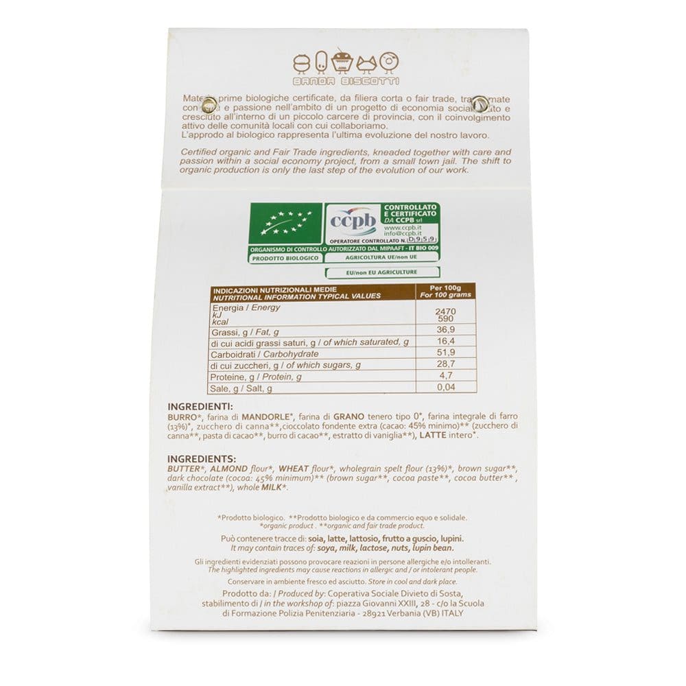 Ingredienti: BURRO*, farina di mandorle*, farina di GRANO tenero tipo 0*, farina integrale di farro (13%)*, zucchero di canna**, cioccolato fondente extra (cacao: 45% minimo) (zucchero di canna, pasta di cacao**, BURRO di cacao*, emulsionante: lecitina di SOIA*, estratto di vaniglia)**, latte intero*.