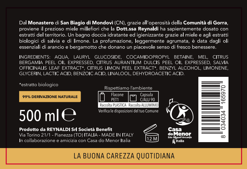 Composizione: aqua, lauryl glucoside, cocamidopropyl betaine, mel, citrus bergamia peel oil expressed,citrus aurantium dulcis peel oil expressed, salvia officinalis leaf extract*, citrus limon peel extract*, benzyl alcohol, limonene, glycerin, lactic acid, benzoic acid, linalool, dehydroacetic acid.