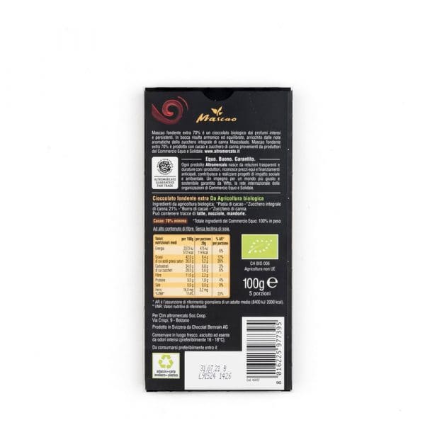 Il Cioccolato Mascao Altromercato è prodotto con cacao proveniente dall’America Latina e arricchito con le note aromatiche dello zucchero integrale di canna Mascobado. Profumi intensi e persistenti, gusto ricco e complesso, ottimo come fine pasto o come piccola trasgressione.