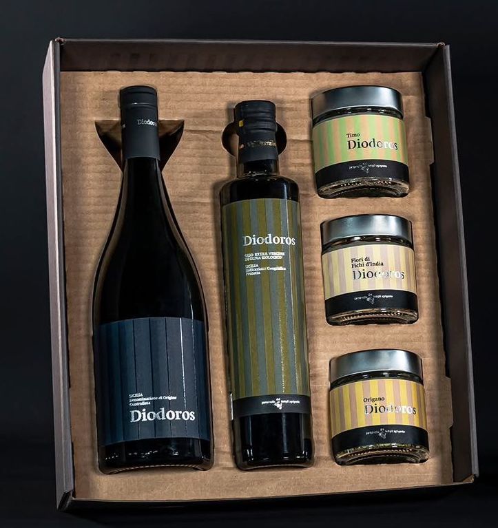 Un cofanetto che racchiude i profumi e i sapori autentici della Valle dei Templi di Agrigento: vino, olio, erbe e marmellata che raccontano la storia di una terra unica, dove natura e cultura si intrecciano da millenni.