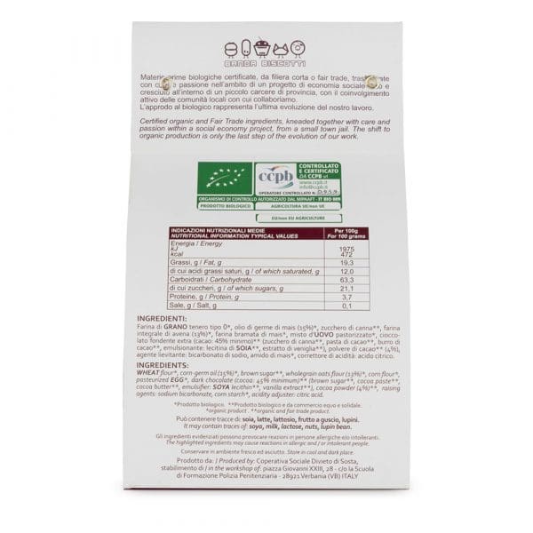 Ingredienti: Farina di grano tenero tipo 0*, burro*, zucchero di canna**, gocce di cioccolato fondente** (cacao: 45% minimo) 5% (zucchero di canna, pasta di cacao, burro di cacao, emulsionante: lecitina di soia, estratto di vaniglia), uovo pastorizzato*, agente lievitante: bicarbonato di sodio, amido di mais*, correttore di acidità: acido citrico.