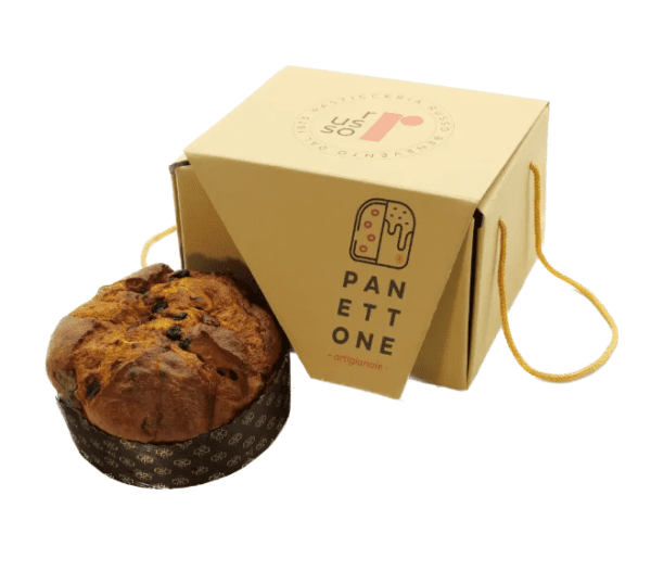 Panettone classico morbido con uvetta e cubetti di arancia candita, a lenta lievitazione secondo metodo tradizionale artigianale con ingredienti semplici e naturali e con il miele beneventano.