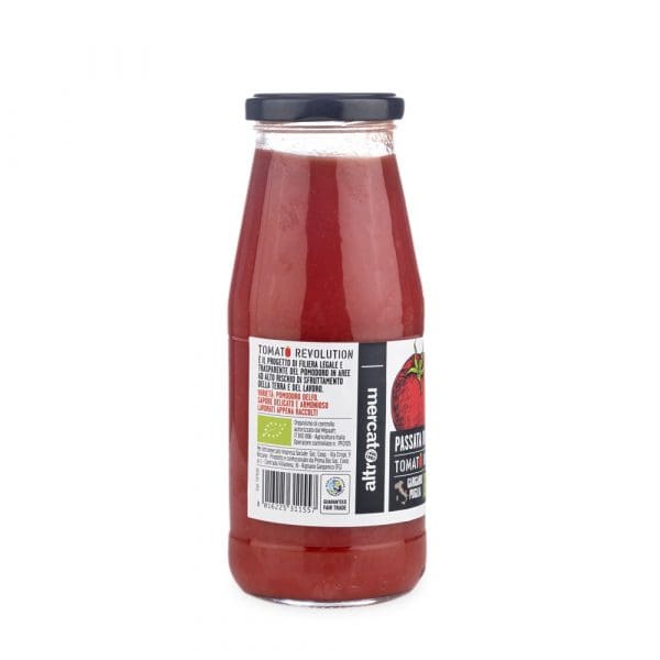 La passata di Pomodoro Tomato Revolution di Altromercato è prodotta in Italia all’interno della filiera Solidale Italiano, che combatte il caporalato e lo sfruttamento del lavoro con un prezzo giusto per gli agricoltori.