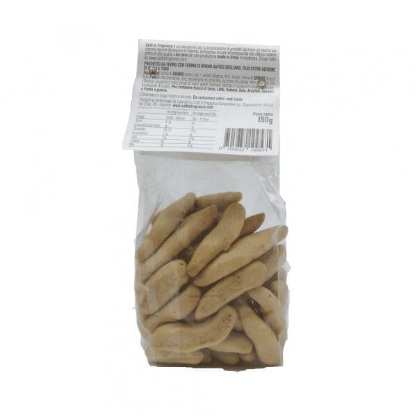 Sono realizzati con la farina di grani antichi siciliani e con laggiunta di Olio Extravergine di oliva e Timo. Mix azzeccato di innovazione e tradizione, sono privi di ingredienti di origine animale e non sono fritti.