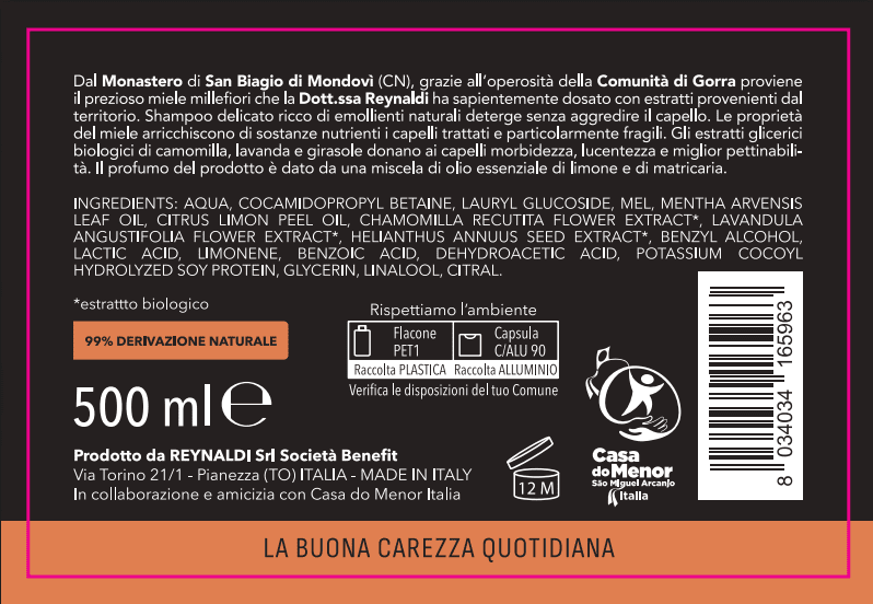 Composizione: aqua, cocamidopropyl betaine, lauryl glucoside, mel, mentha arvensis leaf oil, citrus limon peel oil, chamomilla recutita flower extract*, lavandula angustifolia flower extract*, helianthus annuus seed extract*, benzyl alcohol, lactic acid, limonene, benzoic acid, dehydroacetic acid,potassium cocoyl hydrolyzed soy protein,glycerin, linalool, citral*estratto biologico